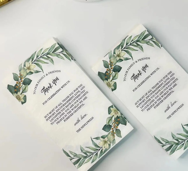 Of het nu gaat om een verjaardagsfeestje, een themabruiloft of een corporate branding-evenement, op maat bedrukte tissues vormen een perfecte aanvulling op het thema en kleurenschema van het evenement. Stelt u zich een prachtige tafeldekking voor, waarbij elk weefsel bedrukt is met het logo van het bruidspaar, een bedrijfsslogan of een feestelijk motief: dit soort doordachte aandacht voor detail demonstreert onmiddellijk de toewijding van de organisator aan kwaliteit. Dit zorgt niet alleen voor gemak voor de gasten, maar versterkt ook op subtiele wijze het thema van het evenement.